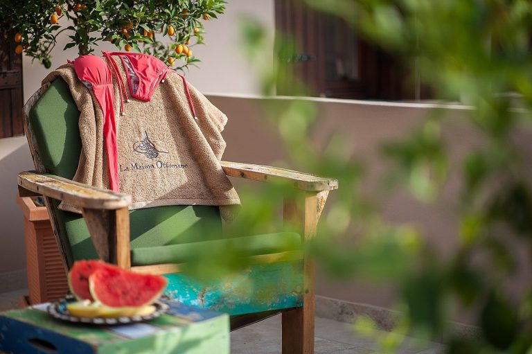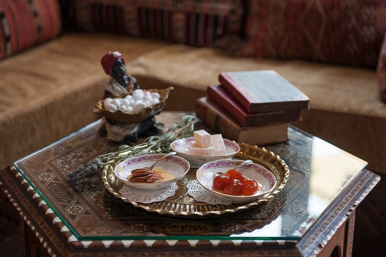 Where elegance and opulence sit side by side, the Aisha suite combines freshness,  serenity and indulgence.  Its Moroccan earth tones are adorned with fine art and embroidered silks – antique wedding belts from Fez hang beside fine paintings on oriental themes.